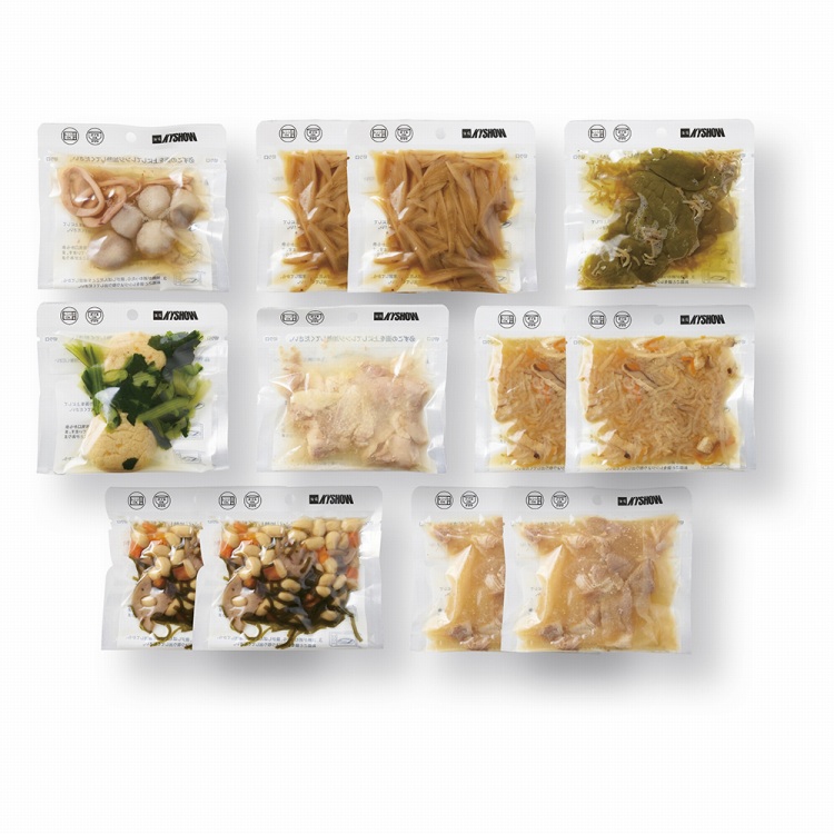 商品内容●セット内容:切干大根100g・ごぼう金平100g・豚肉と大根の味噌煮100g・大豆五目煮100g各2、いか小芋100g・鶏みぞれ煮100g・ひろうすと小松菜の煮物100g・じゃこ甘唐辛子100g各1