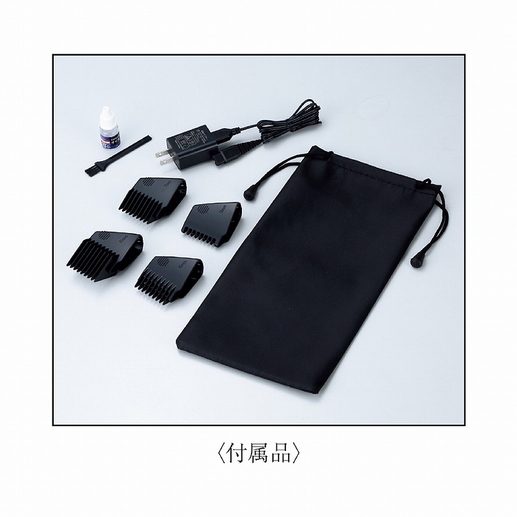●内容:刈り高さアタッチメント4種(約3mm・5mm・7mm・10mm)・ブレードガード(約2mm)・掃除用ブラシ・オイル・収納ポーチ・USBケーブル・ACアダプター付・充電/交流両用式・約90分充電・約45分使用可