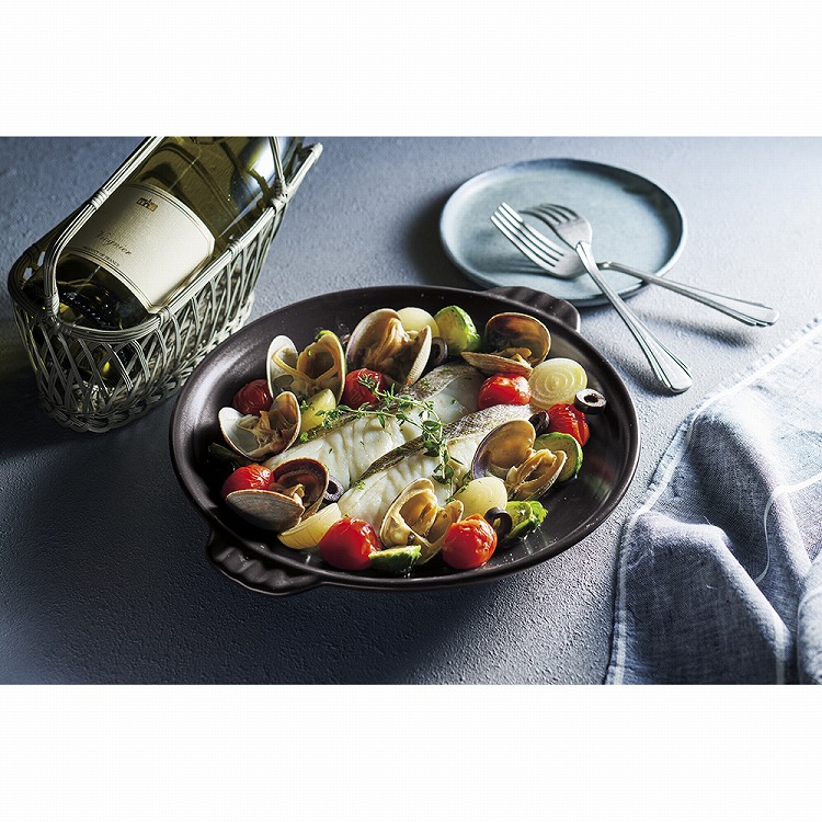 直火調理が可能で、調理したらそのまま食卓に出せる、取っ手の付いた陶板。