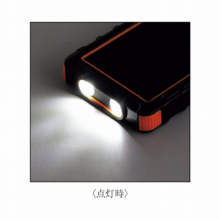 ●内容:USB充電約10時間・ソーラー充電約82時間(晴天時)・LEDライト・USB2口・USBケーブル(本体充電用)付