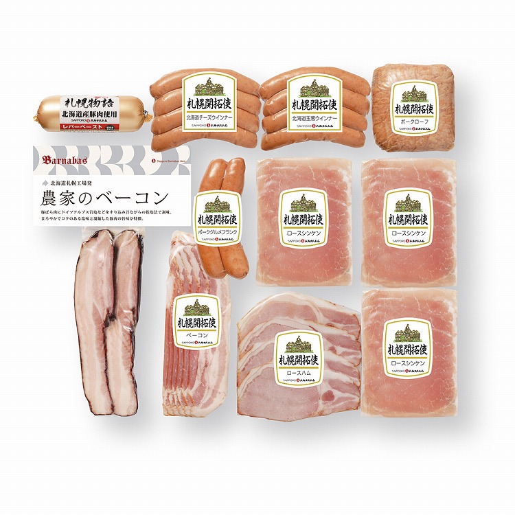 商品内容●セット内容:ロースシンケン(生ハム)40g×3、ポークローフ170g・農家のベーコンステーキカット126g・ポークグルメフランク120g・北海道チーズウインナー100g・北海道玉葱ウインナー100g・レバーペースト100g・ベーコン80g・ロースハム65g各1