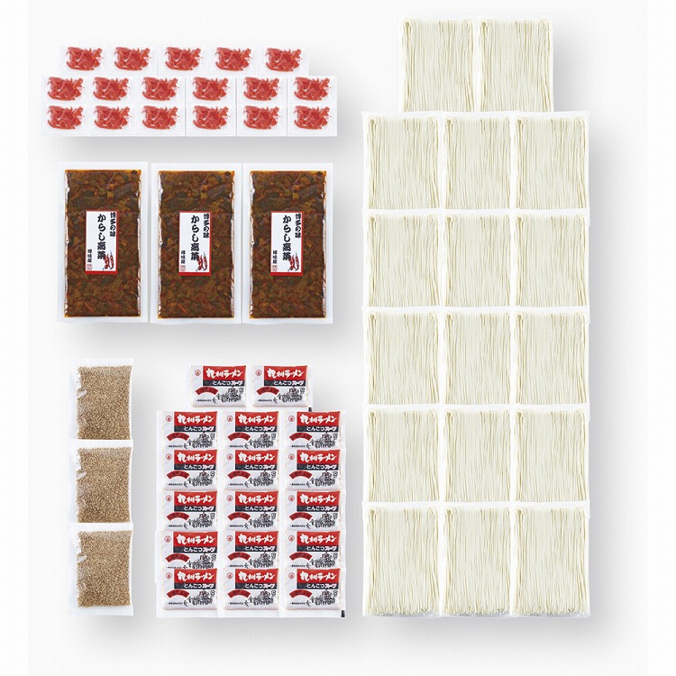 商品内容●セット内容:とんこつ(半生麺100g、スープ付)・紅しょうが各17、辛子たかな110g・すりごま20g各3