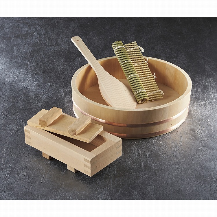 商品内容●商品:押し寿司器(約12×24×高さ7cm)・寿司桶(約径36×高さ9.5cm)・しゃもじ(全長約35cm)・巻きスダレ(約24×24cm)各1