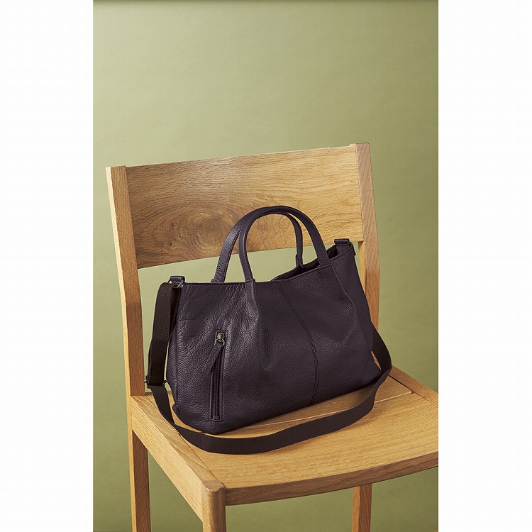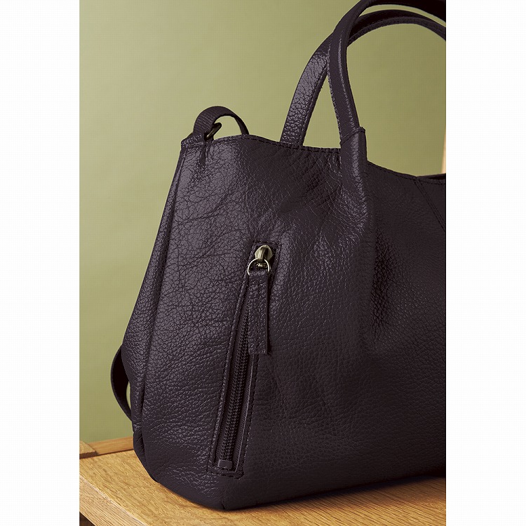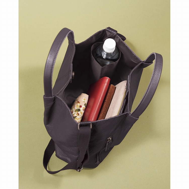 A4サイズの書類が入り、多彩なポケットを備えた牛革製のトートバッグ。