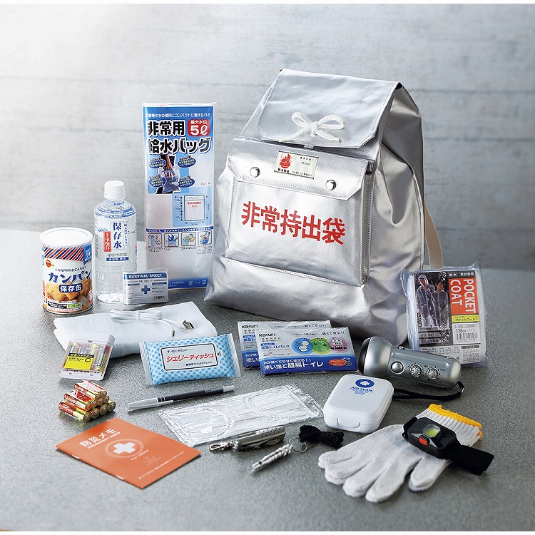 商品内容●商品:非常持出袋(約40×7×高さ40.5cm)・ラジオ付LEDライト(約5.5×5.5×長さ14cm)・LEDヘッドライト(約7×4.1×2.2cm)・電池交換式充電器(約6.1×7.9×高さ1.9cm)・14徳ナイフ・ブルーシート(約180×180cm)・非常用給水バッグ(約5L用)・保存飲料水(500ml・国内産)・サバイバルシート(約213×132cm)・ポケットコート・ホイッスル・軍手・綿タオル(約30×80cm)・ウェットティッシュ・包帯・爪切り・毛抜き・ハサミ・防災メモ・ボールペン各1、マスク・缶入カンパン100g・緊急トイレパック各2、コットン×3、綿棒×10