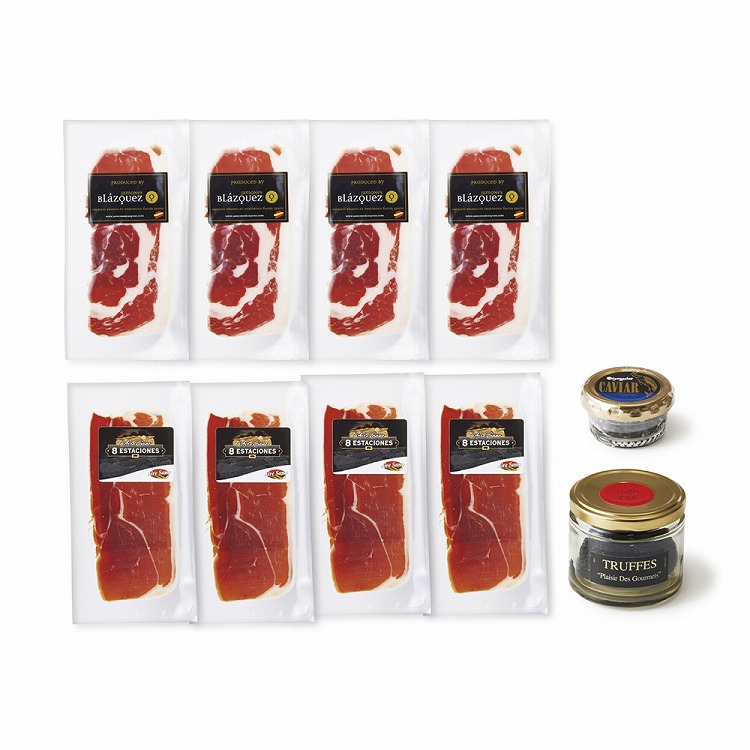 商品内容●セット内容:ハモンテルエル30g・ハモンイベリコ30g各4、サマートリュフ50g・バエリキャビア25g各1