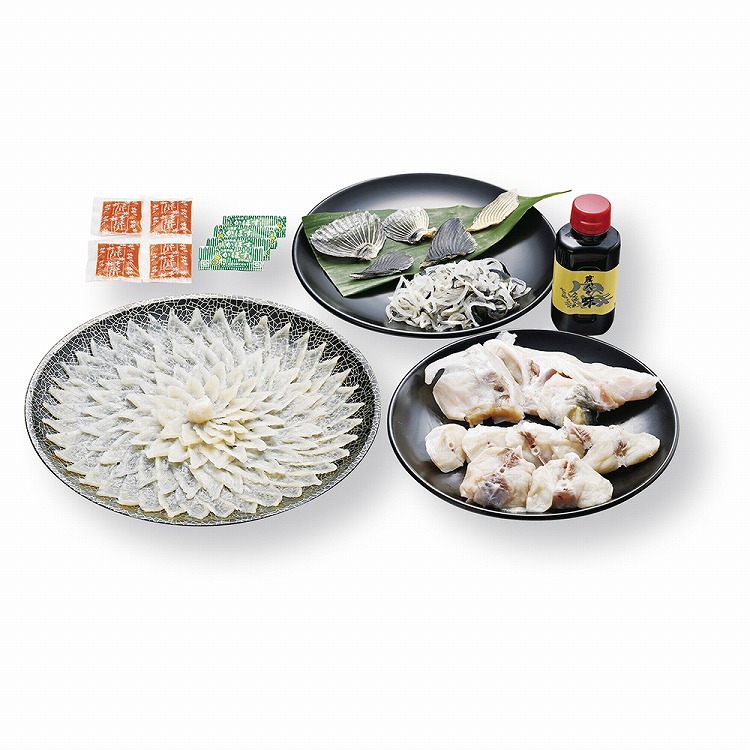 商品内容●セット内容:刺身155g・皮100g・ふぐちり300g・ふぐひれ(5枚)各1、ふくポン酢・もみじおろし・かぼす果汁付