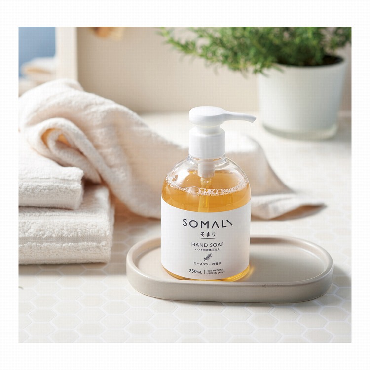 心地良いやさしさと素材へのこだわり 創業100年以上の石鹸メーカー「木村石鹸」のくらしに寄り添うブランド「SOMALI(そまり)」。本当にいいものだからこそ、シンプルに。必要最低限の素材のみを使用し、必要ないものは入れない。使っている素材は小さなお子さんにも安心して使え、環境負荷も少ないものばかりです。 「固形石けんの優しさはそのままに、より使いやすいかたちの液体石けんを」そんな思いから生まれた天然ローズマリーの香りのハンド用液体石けん。タオルはオーガニックコットンを使用した泉州タオル。オーガニックコットンは農薬や化学肥料を使用せず、手間暇かけて栽培されている、人にも環境にもやさしいサステナブルなコットンです。素材の良さをそのままに、無漂白の自然な色で仕上げました。