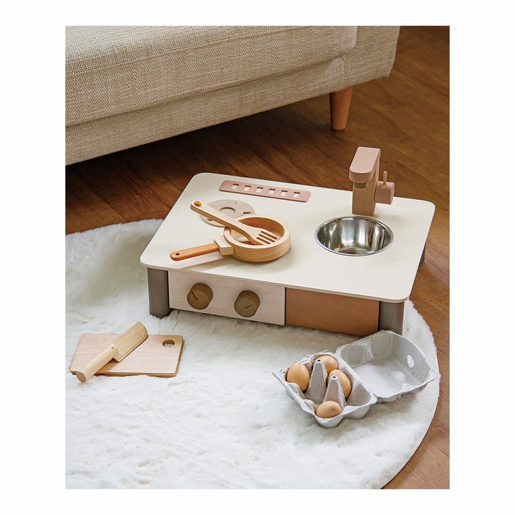 日本の職人が手作りした、おうちにすっとなじむ自然でおしゃれな色あいのままごとキッチンです。