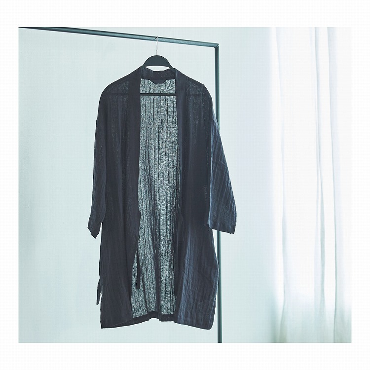 日本のもの作りが織りなす美しさと機能性 230年以上の歴史を持つ「播州織」。播州織とは兵庫県北播磨地域で生産されるテキスタイルのことです。糸の状態から染め上げることで、繰り返し使用しても色があせにくく、丈夫で、肌触りがいいことが特長です。生地はオーガニックコットンを100%使用した二重クレープガーゼを使用しており、ガーゼ組織になっていることで、吸水性、通気性、速乾性に優れているだけでなく、強撚糸と呼ばれる強く撚った糸を横糸に使用することで生地に独特の凹凸感を出して軽くてさらっとした着心地を実現しております。 日本の伝統着である“作務衣”の着丈を長くすることでモダンにアップデートしたオリジナルデザインです。家の中でも外でも羽織れる日常着として着用して頂けます。日本のもの作りが織りなす美しさと機能性が現代の暮らしに寄り添います。