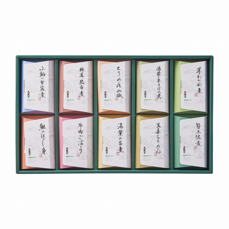 商品内容●セット内容:牛肉ごぼう50g・ちりめん山椒45g・生姜ちりめん45g・鮭のほぐし身40g・椎茸昆布煮40g・湯葉の旨煮40g・湯葉と牛そぼろ煮40g・筍土佐煮40g・小鮎の甘露煮40g・茎わかめ煮40g各1