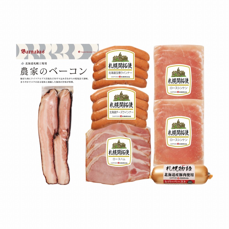 商品内容●セット内容:ロースシンケン(生ハム)40g×2、農家のベーコンステーキカット126g・北海道チーズウインナー100g・北海道玉葱ウインナー100g・レバーペースト100g・ロースハム65g各1