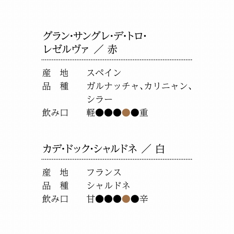 商品内容●グラン・サングレ・デ・トロ・レゼルヴァ750ml、カデ・ドック・シャルドネ750ml、ソムリエナイフ付