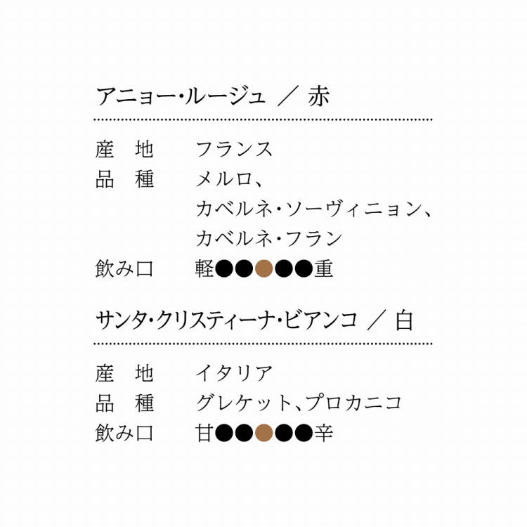 商品内容●アニョー・ルージュ750ml、サンタ・クリスティーナ・ビアンコ750ml、ソムリエナイフ付
