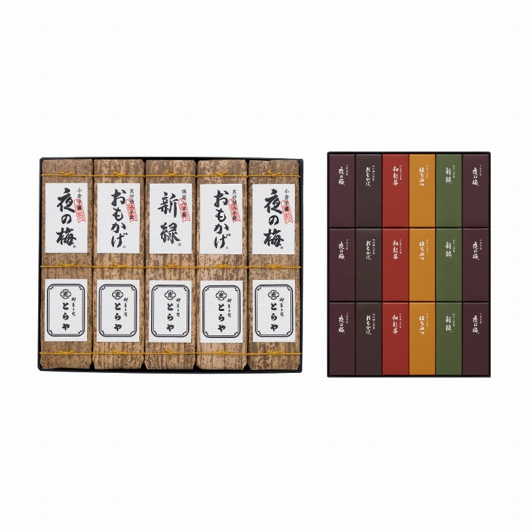 商品内容●セット内容:竹皮包羊羹(小倉羊羹 夜の梅660g〈330g×2〉・黒砂糖入羊羹 おもかげ660g〈330g×2〉各2、抹茶入羊羹 新緑660g〈330g×2〉×1)、小形羊羹(小倉羊羹 夜の梅50g×6、黒砂糖入羊羹 おもかげ50g・抹茶入羊羹 新緑50g・蜂蜜入羊羹 はちみつ50g・和紅茶入羊羹 和紅茶50g各3)