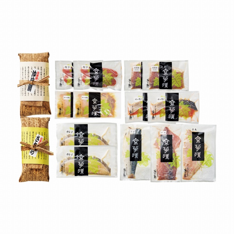 商品内容●セット内容:竹皮包み(沖目鯛〈ホワイトワレフー〉130g・鰆130g各5)、鱈子130g・松阪豚モモ100g・みつせ鶏100g・サーモントラウト80g・カラスカレイ80g各2、鯖(半尾)200g・いか190g・赤魚150g各1