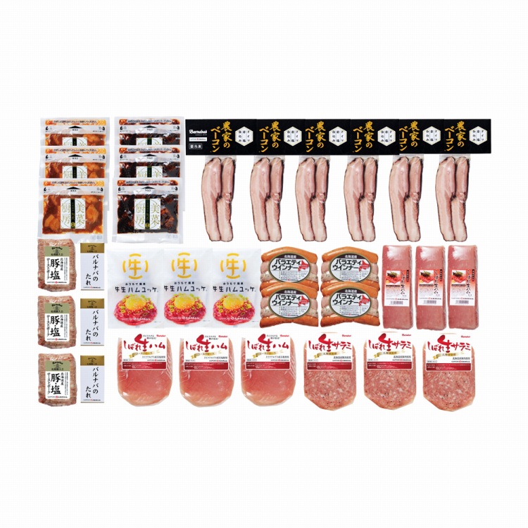 商品内容●セット内容:農家のベーコンステーキカット126g×6、北海道産バラエティウインナー4種100g×4、しばれ生ハム冊取り200g・ローストポーク(肩ロース/北海道産)170g・北海道産豚角煮(醤油)100g・北海道産豚角煮(味噌)100g・しばれ生ハムスライス80g・しばれ生サラミスライス80g・牛生ハムユッケ56g(牛生ハム40g、タレ・ゴマ付)各3、タレ付