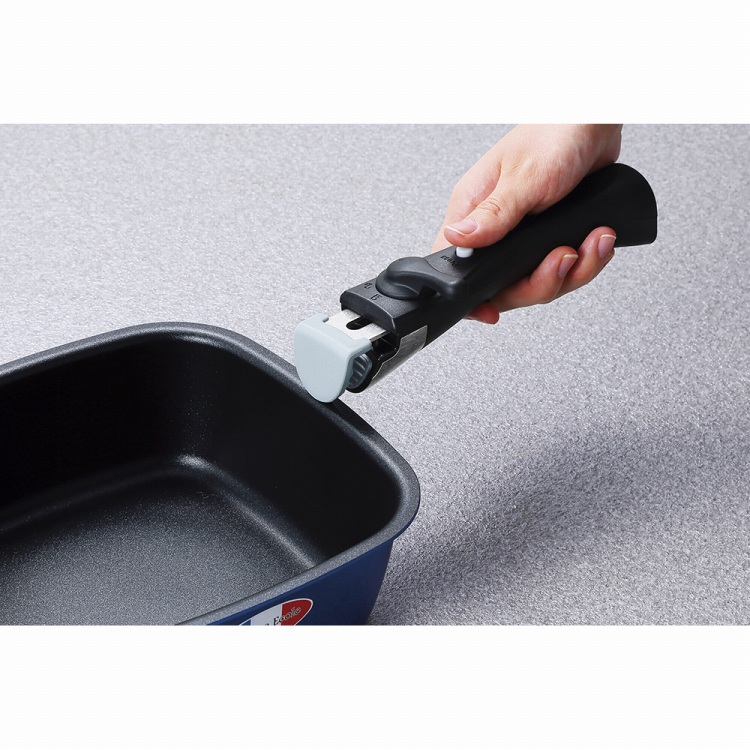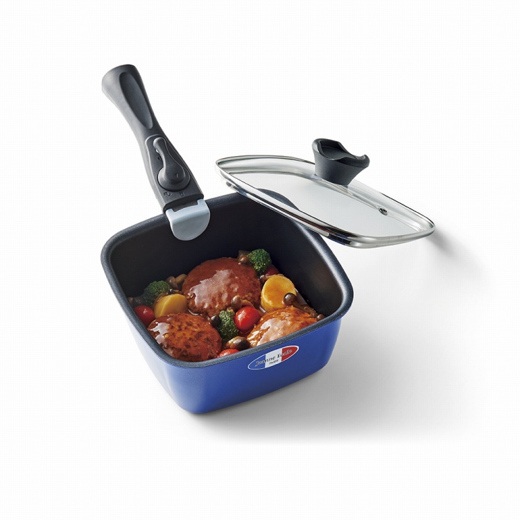 深いブルーのボディがキッチンに馴染むハンドル着脱式の鍋。