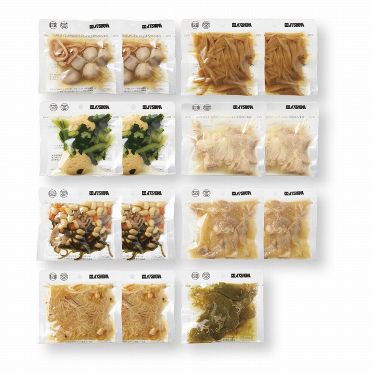 商品内容●セット内容:切干大根100g・ごぼう金平100g・いか小芋100g・鶏みぞれ煮100g・豚肉と大根の味噌煮100g・ひろうすと小松菜の煮物100g・大豆五目煮100g各2、じゃこ甘唐辛子100g×1