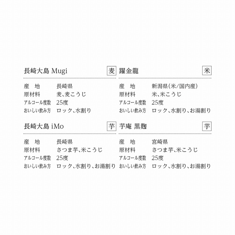 商品内容●長崎大島 Mugi720ml、 長崎大島 iMo720ml、躍金龍720ml、芋庵 黒麹720ml、コースター付