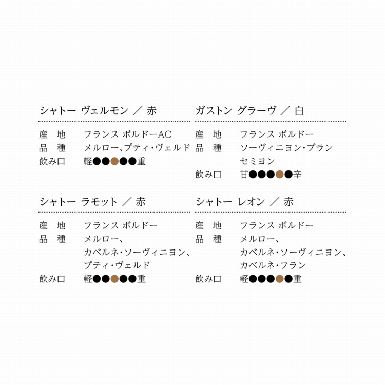 商品内容●シャトー ヴェルモン750ml、シャトーラモット750ml、ガストン グラーヴ750ml、シャトー レオン750ml、ソムリエナイフ付