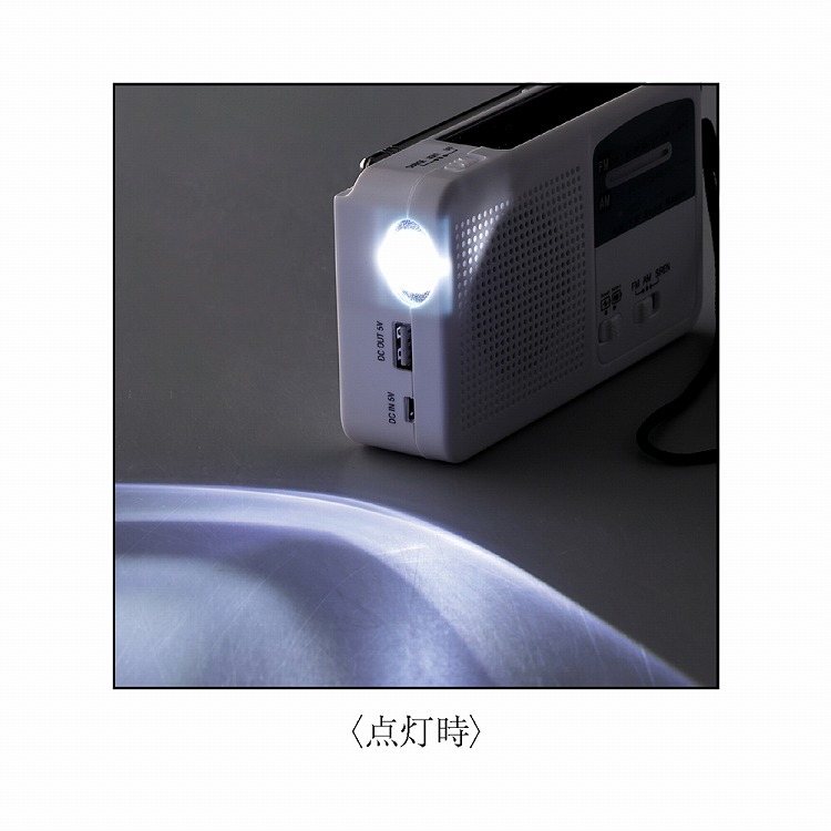 ●機能:ソーラー充電・手回し発電・携帯電話充電・サイレン・LEDライト・FM/AMラジオ