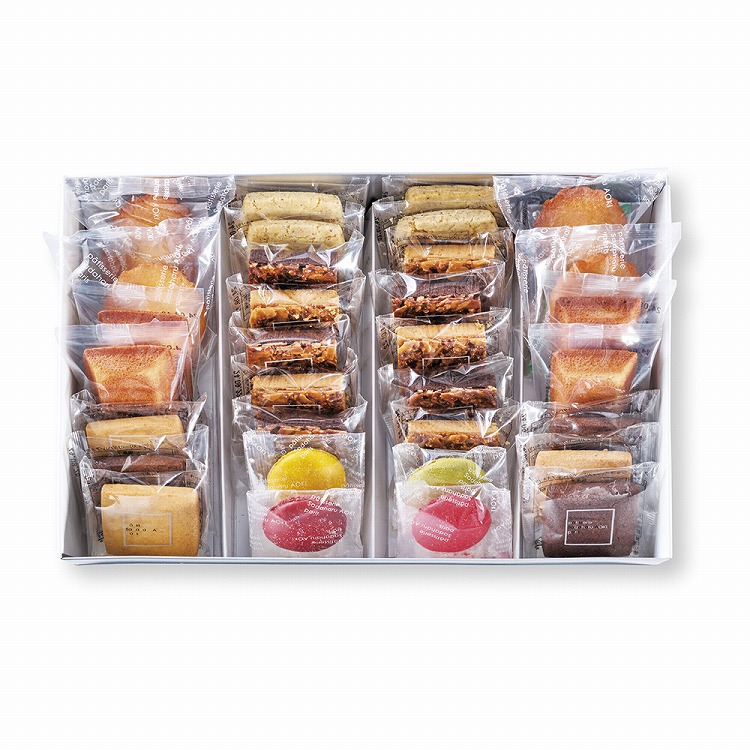 商品内容●セット内容:サブレ ノワゼット・マドレーヌ シトロン ベルガモット・フィナンシェ ナチュール各4、フロランタン(ナチュール・ショコラ各5)、クッキー(ヴァニーユ・ショコラ各3)、マカロンラスク(ショコラ・赤・黄・緑各1)