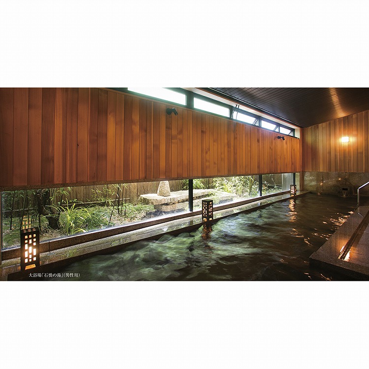 花兆庵1階にある内風呂は、開放感のある大きなガラス窓を配しており、広い湯殿で手足を思いっきり伸ばし、心ゆくまでおくつろぎください。