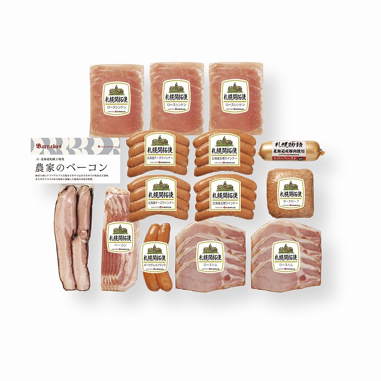 商品内容●セット内容:ロースシンケン(生ハム)40g×3、北海道チーズウインナー100g・北海道玉葱ウインナー100g・ロースハム65g各2、ポークローフ170g・農家のベーコンステーキカット126g・ポークグルメフランク120g・レバーペースト100g・ベーコン80g各1