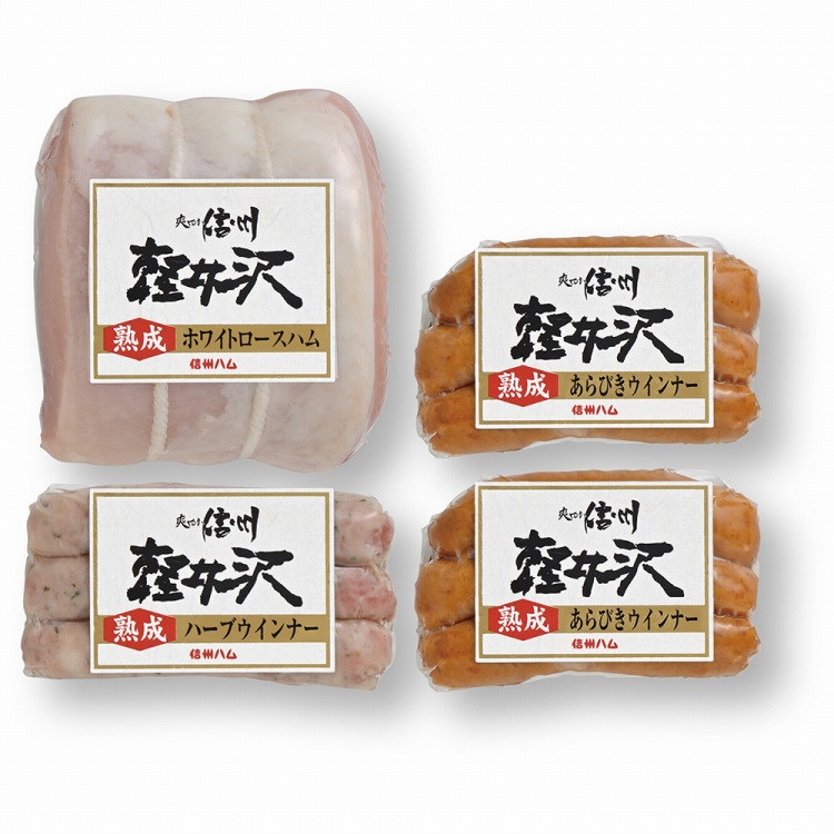 商品内容●セット内容:軽井沢熟成ホワイトロースハム300g・軽井沢熟成ハーブウインナー58g各1、軽井沢熟成あらびきウインナー58g×2