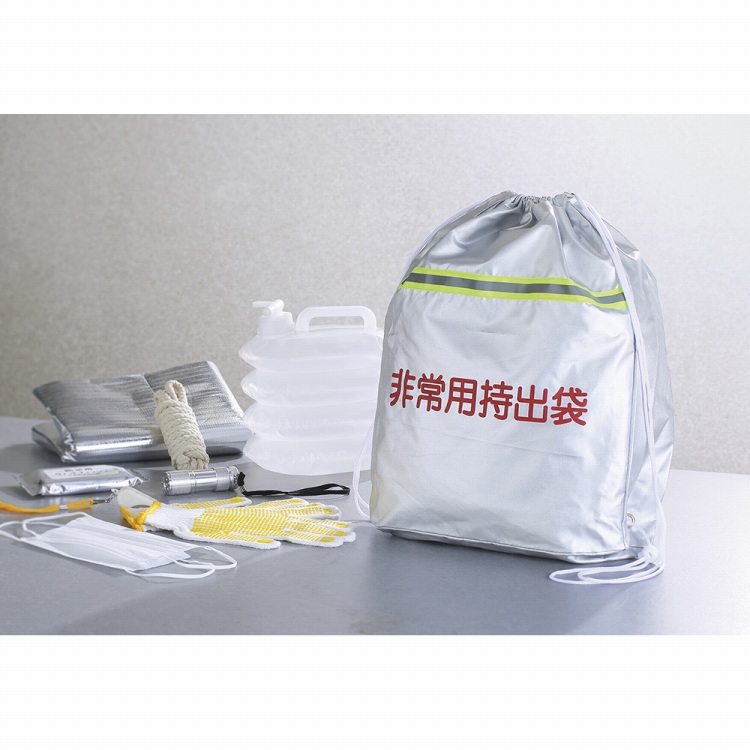 商品内容●商品:非常用持出袋(約33×44cm)・ジャバラ式タンク(約3L用)・保温アルミシート(約180×90cm)・非常用ロープ(約3m)・軍手・ホイッスル・フラッシュ9灯ライト・ウェットティッシュ・マスク(5枚入)各1