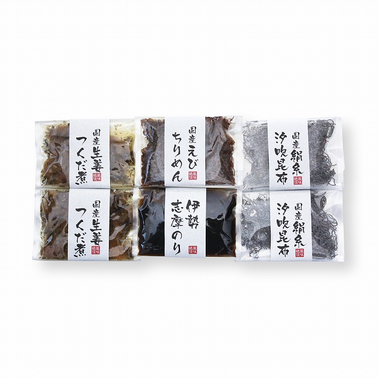 商品内容●セット内容:生姜つくだ煮50g・絹糸汐吹昆布20g各2、伊勢志摩のり100g・えびちりめん30g各1