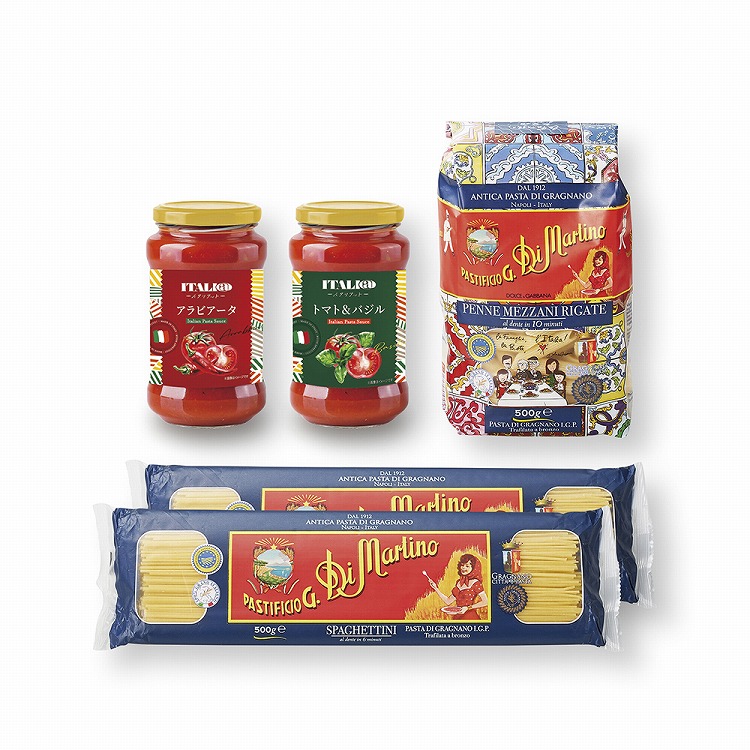 商品内容●セット内容:スパゲッティー500g×2、ペンネリガーテ500g×1、トマトソース(トマト&バジル400g・アラビアータ400g各1)