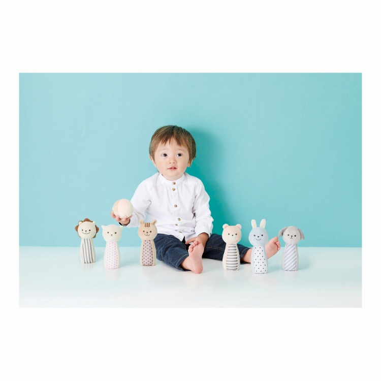 ボールを転がして動物のピンを倒すと、中の鈴がやさしく鳴ります。