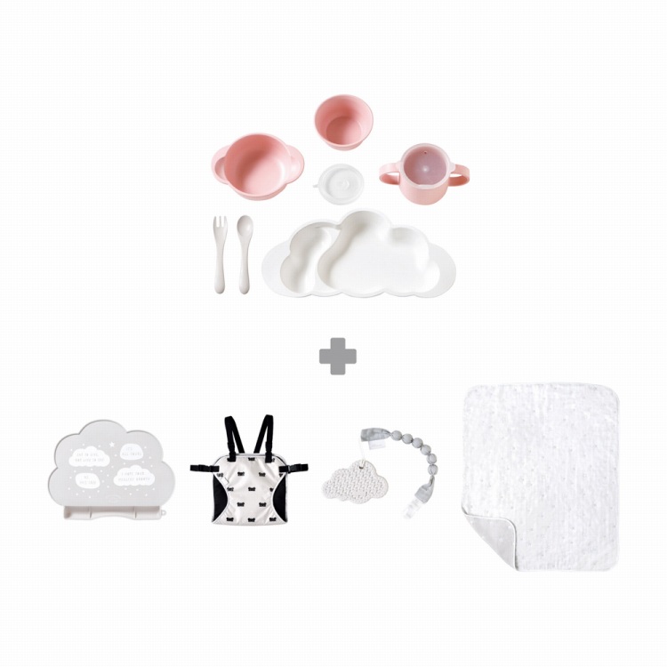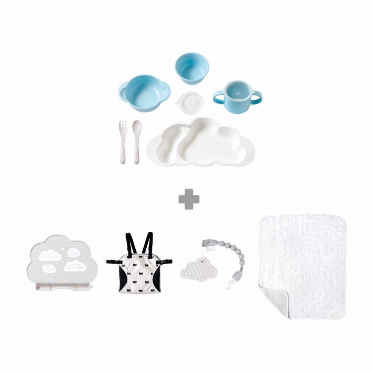 くも型のプレート、トレーニングふた付きコップ等のお子さまが自分で食べやすいように設計された食器セットと、シリコンマット、チェアベルト、6重ガーゼケット、歯がためをセットにしました。