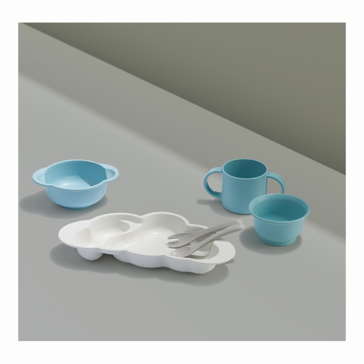 ●材質:プレート・みみ付きスープわん・おちゃわん・コップ・フォーク・スプーン/竹粉配合バイオマスプラスチック、コップトレーニングふた、ストッパー/ソフトエラストマー