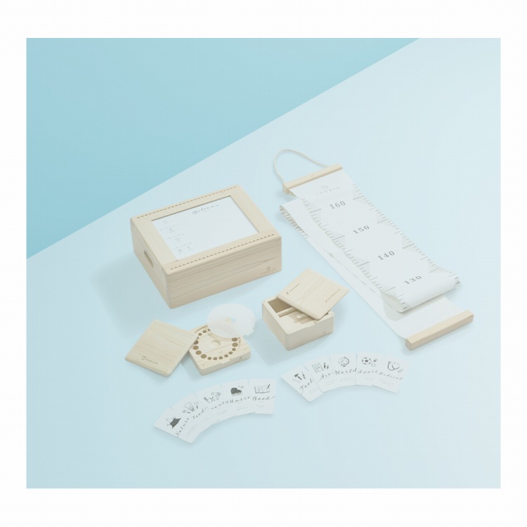 乳歯ケース、へその緒・ファーストヘアケース、身長計タペストリーなど、生まれてからの成長の記録をのこせるセットです。