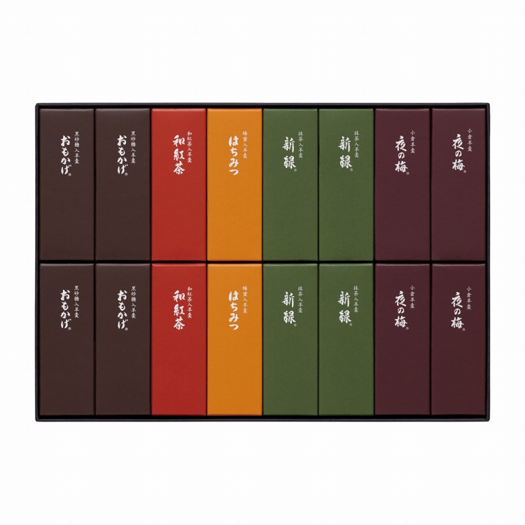 商品内容●セット内容:小倉羊羹 夜の梅50g・黒砂糖入羊羹 おもかげ50g・抹茶入羊羹 新緑50g各4、蜂蜜入羊羹 はちみつ50g・和紅茶入羊羹 和紅茶50g各2