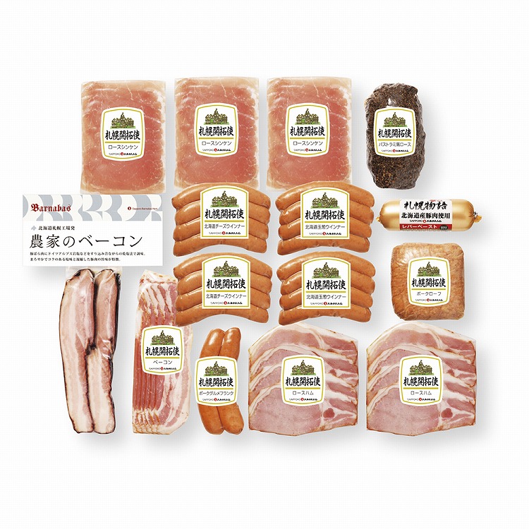 商品内容●セット内容:ロースシンケン(生ハム)40g×3、北海道チーズウインナー100g・北海道玉葱ウインナー100g・ロースハム65g各2、パストラミ肩ロースハム300g・ポークローフ170g・農家のベーコンステーキカット126g・ポークグルメフランク120g・レバーペースト100g・ベーコン80g各1
