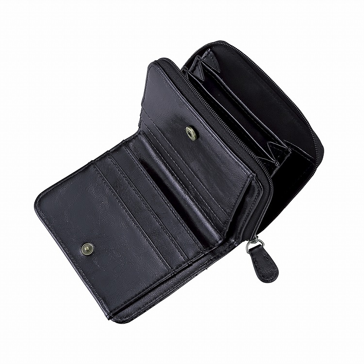 ●内容:札入・ファスナー式小銭入(仕切り付)各1室・ポケット×2・カード入×4、開閉部ホック式