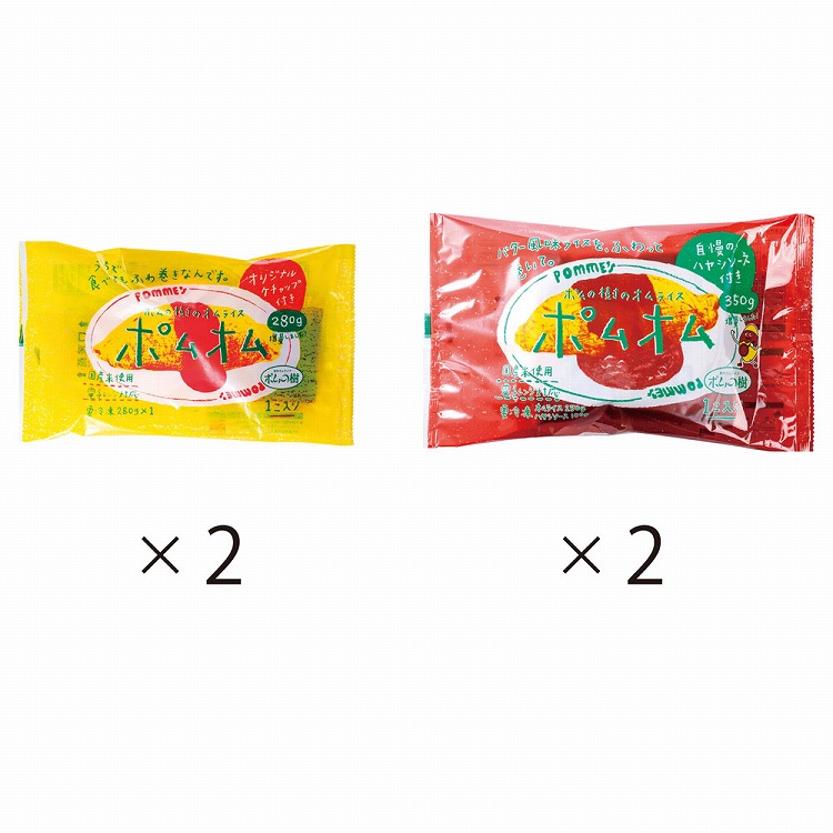 商品内容●セット内容:ポムオム280g(オムライス250g、ケチャップ付)・ポムオムハヤシ350g(オムライス250g、ハヤシソース付)各2