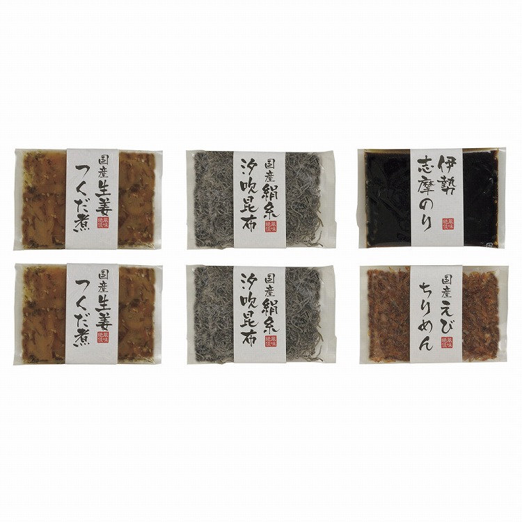 商品内容●セット内容:生姜つくだ煮50g・絹糸汐吹昆布20g各2、伊勢志摩のり100g・えびちりめん30g各1