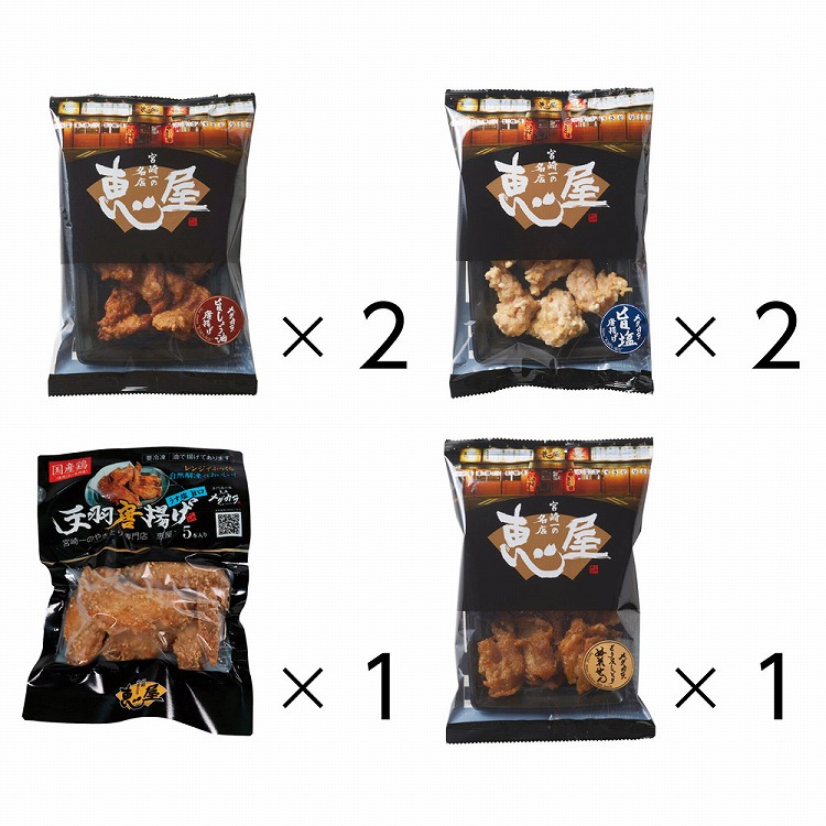 醤油味と塩味2種類の味が楽しめる唐揚げと、恵屋創業当時からの秘伝のレシピで作られた手羽唐揚げ、噛めば噛むほど深い味わいが楽しめるとり皮しっとりぬれせんを詰め合わせました。