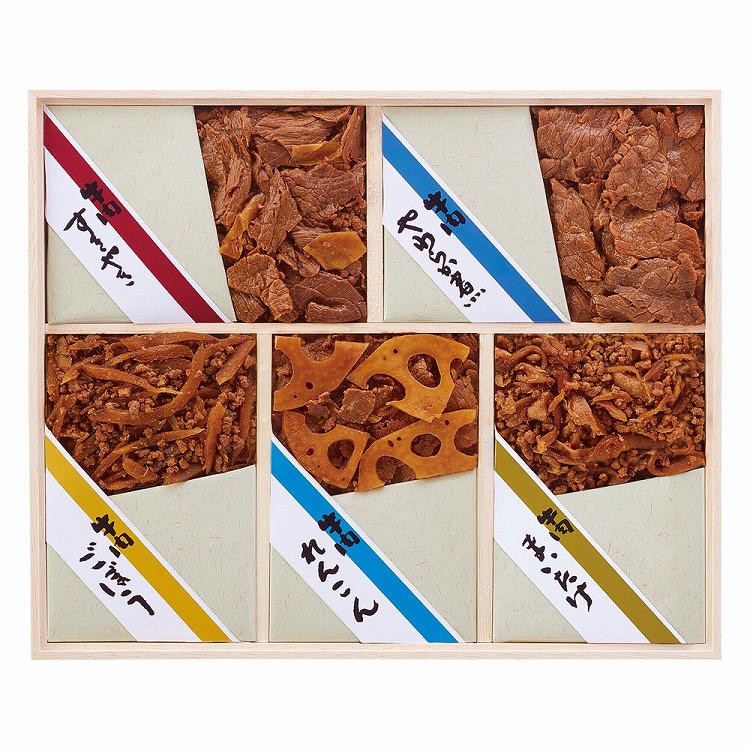商品内容●セット内容:牛肉すきやき50g・牛肉やわらか煮50g・牛肉ごぼう50g・牛肉まいたけ50g・牛肉れんこん50g各1