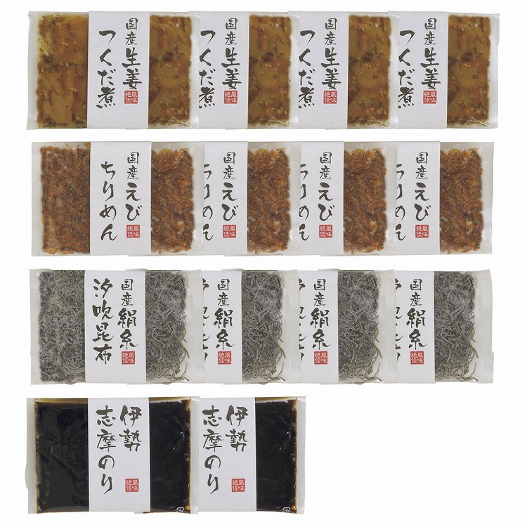 商品内容●セット内容:生姜つくだ煮50g・えびちりめん30g・絹糸汐吹昆布20g各4、伊勢志摩のり100g×2