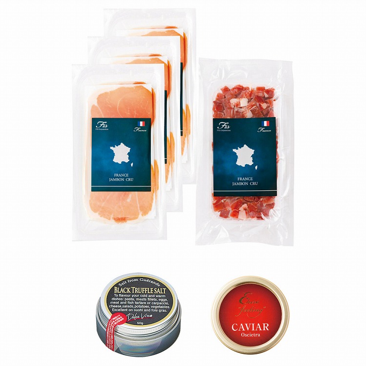 商品内容●セット内容:ジャンボンセックスライス20g(2枚入り)×3、ジャンボンセックダイス100g・黒トリュフソルト50g・オセトラキャビア30g各1