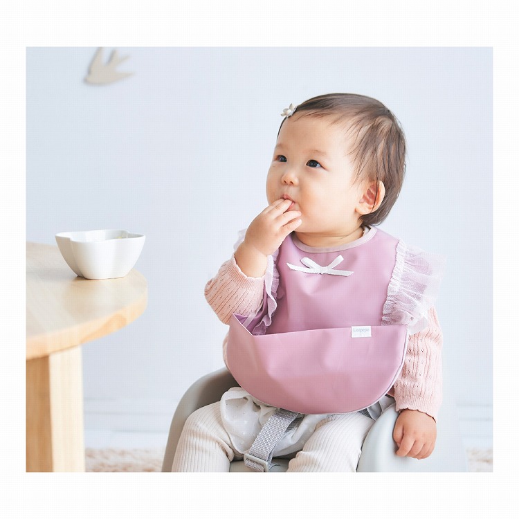 撥水加工を施した素材のお食事エプロンは、ひっくり返すと食べこぼしや飲みこぼしをキャッチするポケット付きに変身。