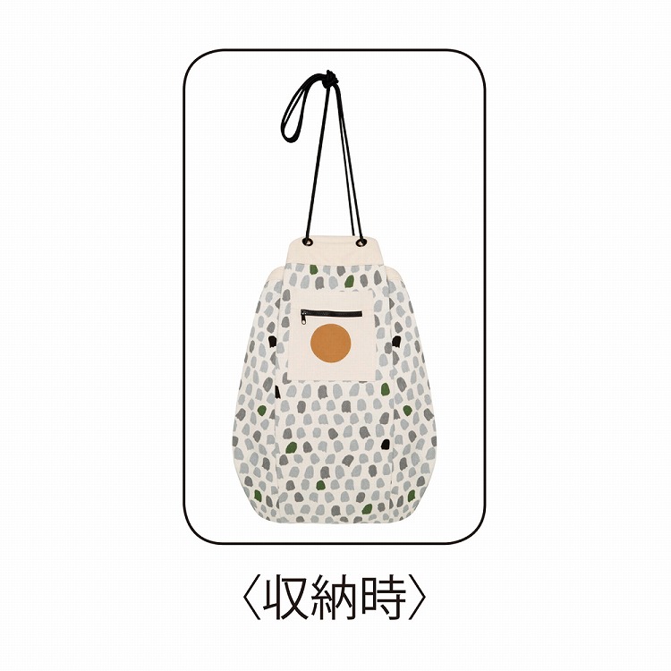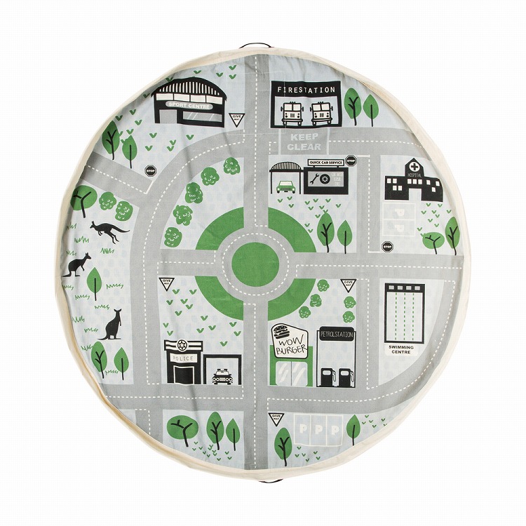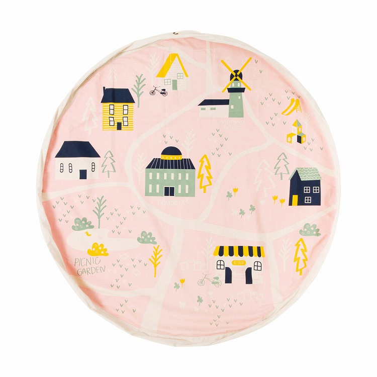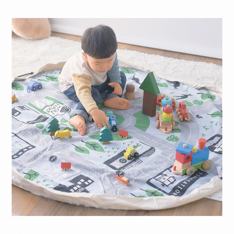 プレイマットとしてあそんだ後、おもちゃを載せたまま付属の紐を引っ張って絞るとお片づけができる収納バッグに早変わり。
