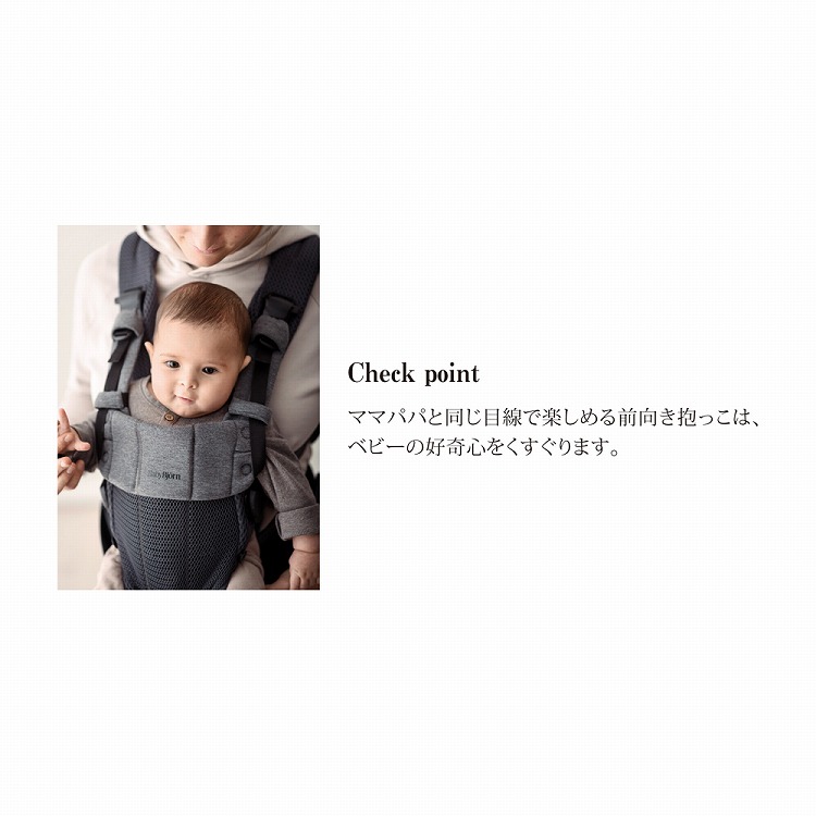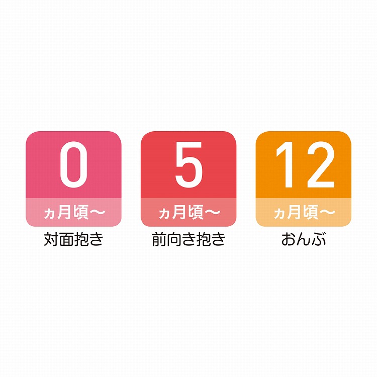 ●対象年齢:対面抱き(首すわり前)/0ヵ月〜4ヵ月頃(適応身長53cm〜・適応体重3.2kg〜)、対面抱き(首すわり後)/4ヵ月頃〜24ヵ月頃(適応身長62cm〜・適応体重13kgまで)、前向き抱き(首すわり後)/5ヵ月頃〜15ヵ月頃(適応身長68cm〜・適応体重12kgまで)、おんぶ(首すわり後)/12ヵ月頃〜36ヵ月頃(適応身長〜約100cm・適応体重15kgまで)