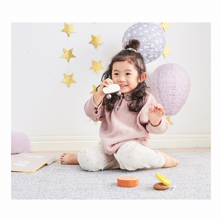 北風と太陽のお話をイメージしてデザインされた、ベル・シェーカー・カスタネットの音が楽しめる楽器セット。
